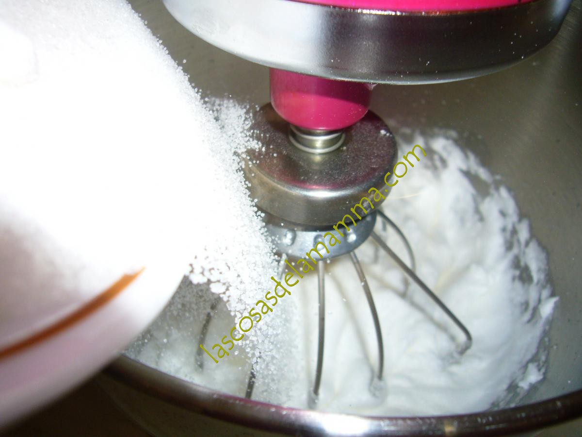 cuando las claras empiecen a hacer picos, ir añadiendo el azúcar poco a poco en cascada,